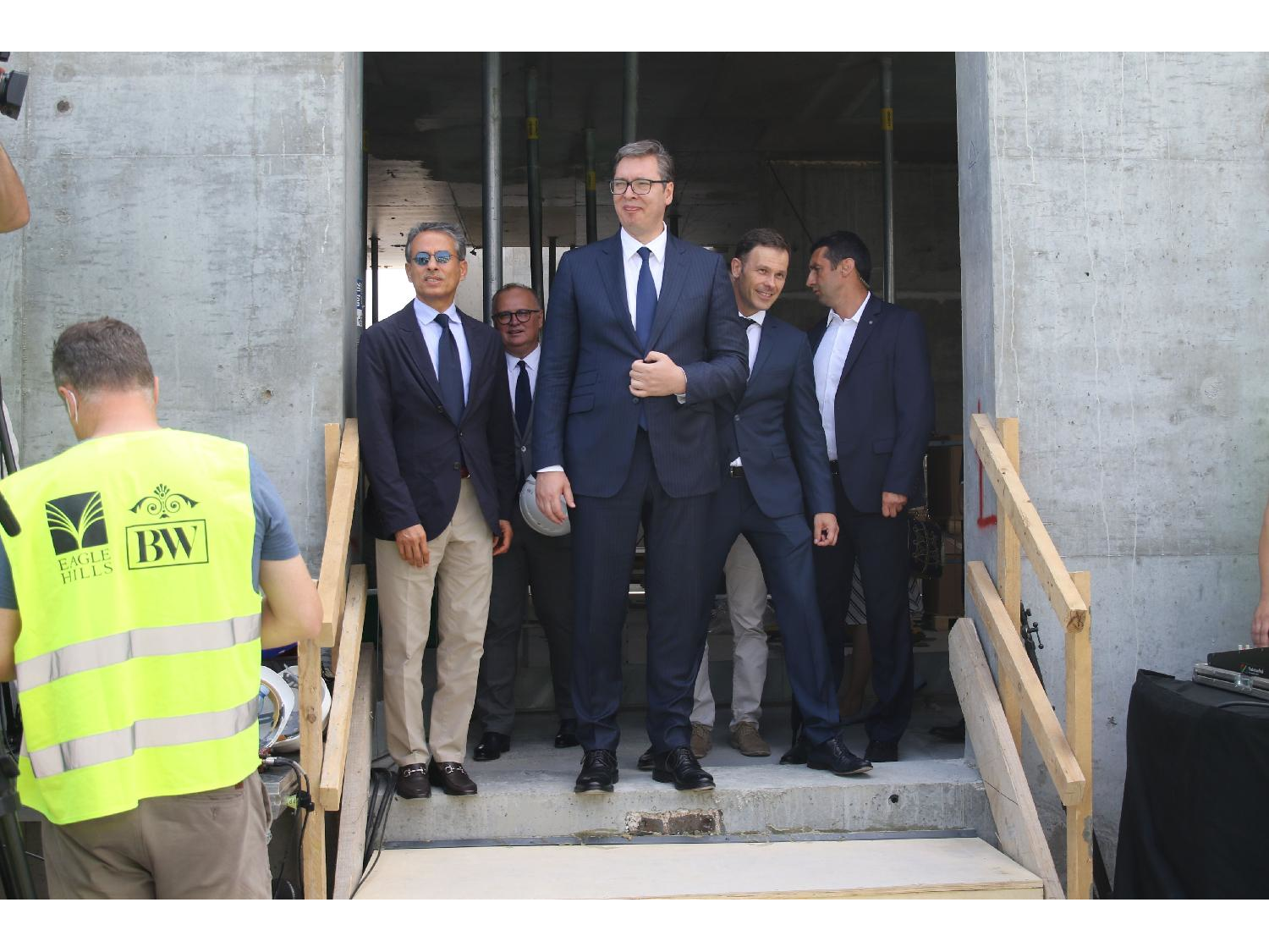 Vučić je sa predsednikom Kompanije "Igl Hils" Mohamedom Alabarom i ministrom finansija Sinišom Malim simboličnim nalivanjem betona označio završetak radova na konstrukciji kule koja dominira Beogradom na vodi.